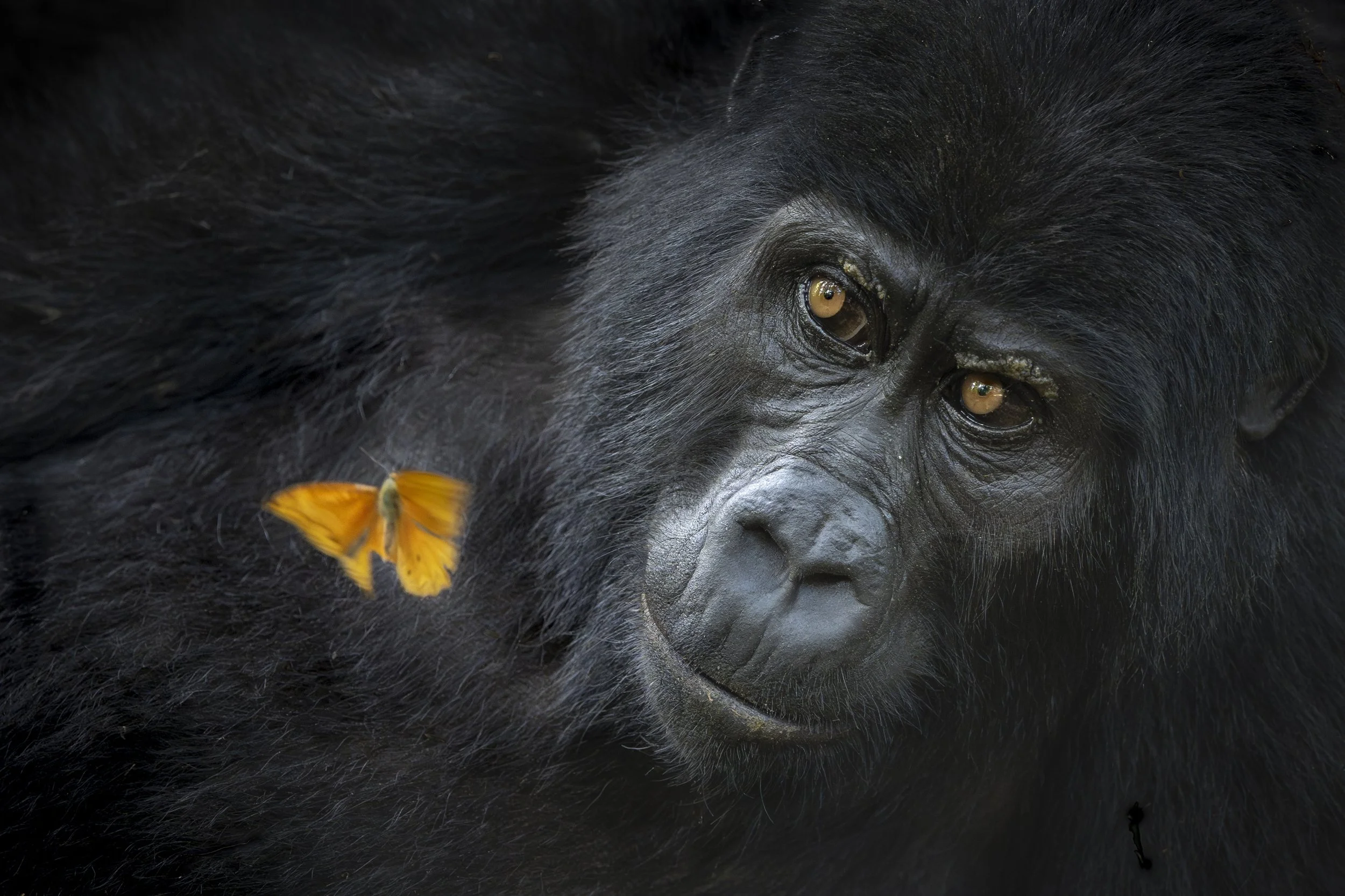 It was a day defined by quiet connections. Beneath the lush canopy of Bwindi, I observed a young female gorilla gently nestled against the protective bulk of a silverback. The atmosphere was serene, filled with gentle sounds of the forest, until a sudden burst of delicate color broke through the calm. An unexpected visitor, a vibrant butterfly, appeared out of nowhere, fluttering gently through the air. Captivated, the young gorilla's eyes widened, and in that moment, a beautiful interaction unfolded as a silent, shared wonder between two vastly different beings. I held my breath, hoping the butterfly would drift ever closer, bringing the unlikely pair into a shared world of curiosity. My heart raced quietly, aware of how rare and precious these moments are. As the butterfly danced gracefully around the gorilla, it seemed to embody the delicate beauty and fragile interconnectedness of our natural world. This photograph captures not just the gorilla's gentle curiosity but also a brief, beautiful moment where two creatures paused, noticing each other, bound by wonder and discovery.
