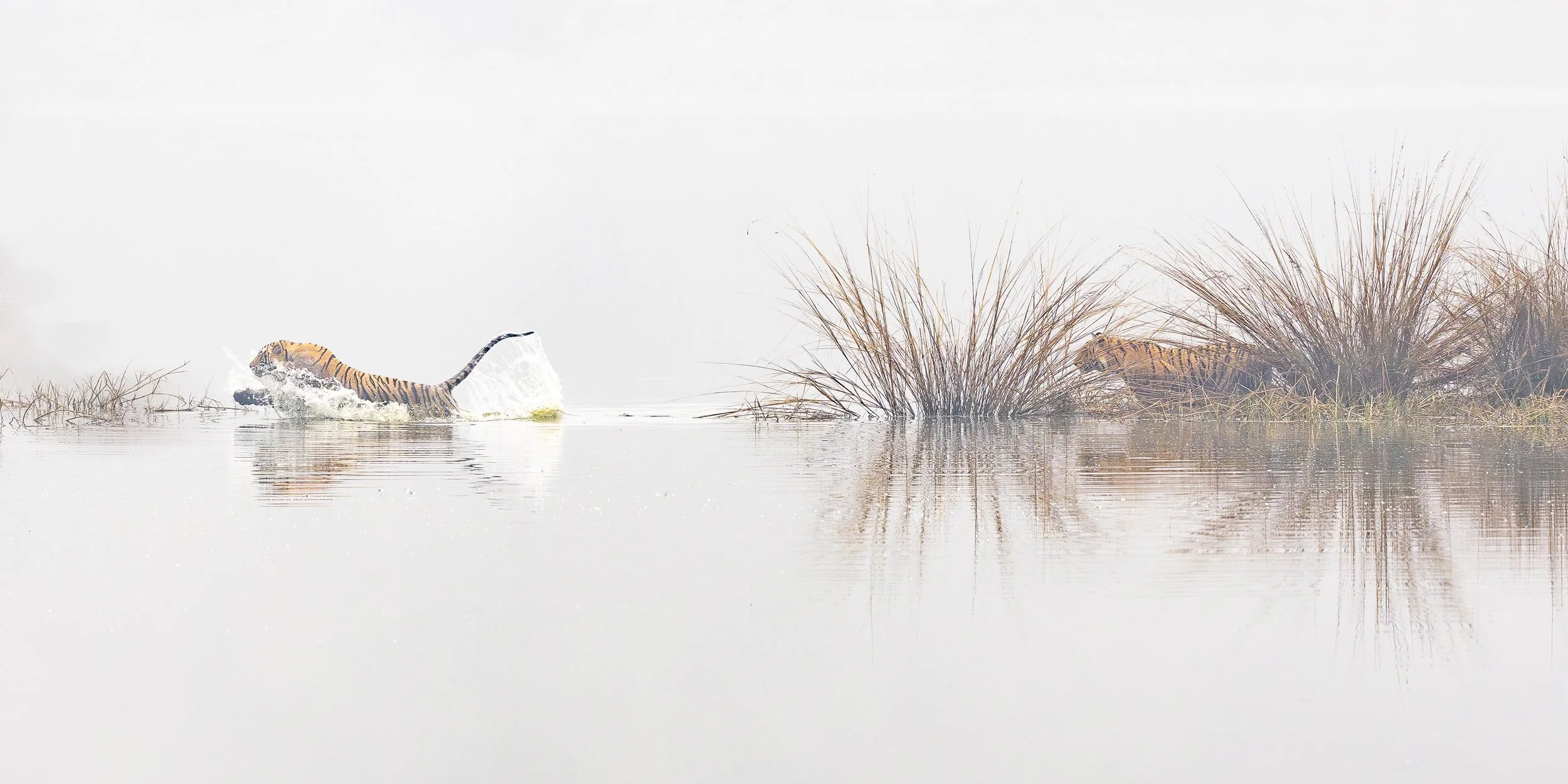 A hungry brown bear launches headlong into a creek in Alaska's Katmai National Park to try to catch one of the many sockeye salmon spawning in large numbers during their seasonal migration. Each August, large concentrations of brown bears gather along the rivers and creeks in Katmai, waiting for the annual arrival of salmon from the coast. I observed this scene after a two-hour walk from our camp from atop a cliff. I positioned myself at the cliff's edge to get a unique perspective looking down on the action below and used a polarizing filter to cut any glare from the water's surface. As the hungry predator approached the water, I used a fast shutter burst to freeze the moment when two nearby salmon dart away in diagonals from the outstretched claws of the diving bear.