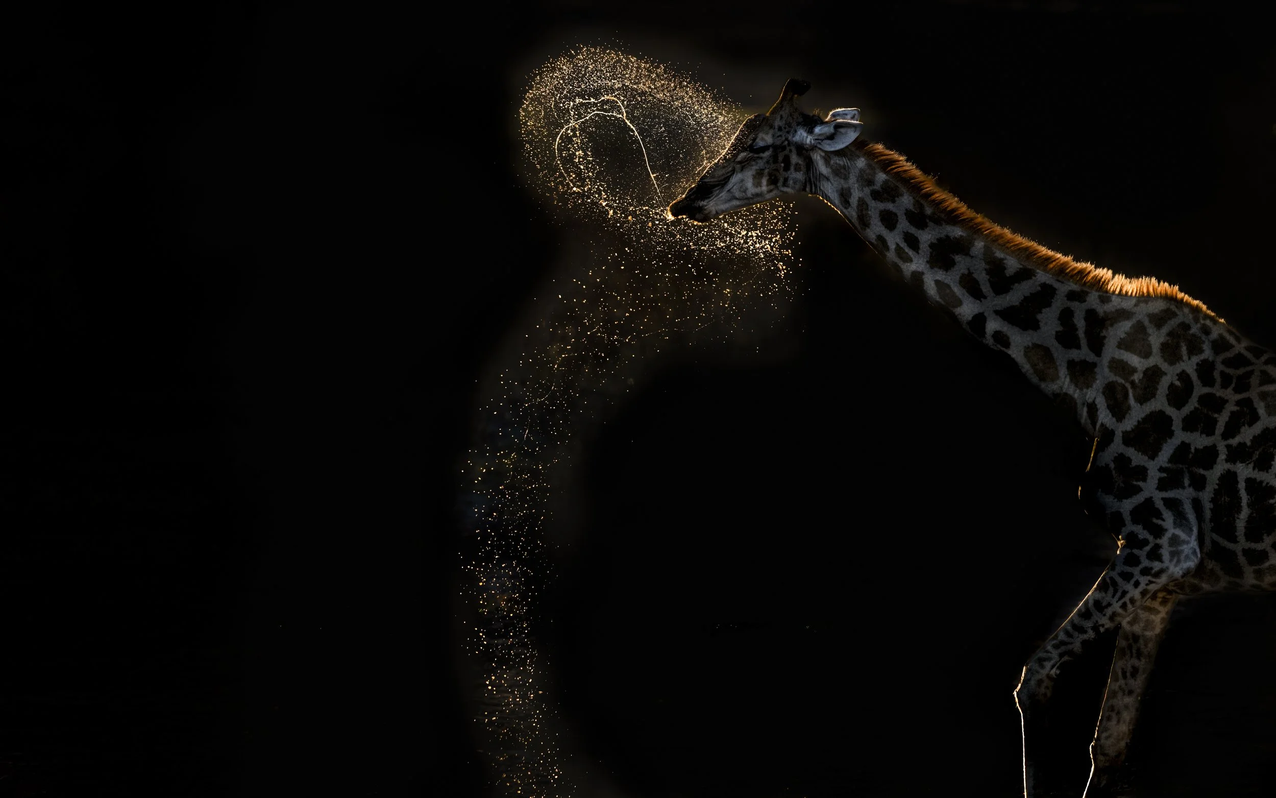 As the sun dipped low over the dry Makgadikgadi landscape in Botswana, a lone giraffe stepped to the water’s edge. Towering and graceful, it bent its long legs, lowering its neck for a drink. Then came a moment of magic. Having taken its fill, the giraffe lifted its head - and with a gentle swish, expelled a stream of water in an arc that shimmered in the golden light. The droplets danced in the air, forming a near-perfect circle before falling back to the earth. With the animal's outline enhanced by the rim lighting, golden reflections sparkled off the airborne water. A rare and fleeting behaviour, made unforgettable by the setting sun. My desire was to capture the interplay of the golden light and the motion of the swishing of the water.
